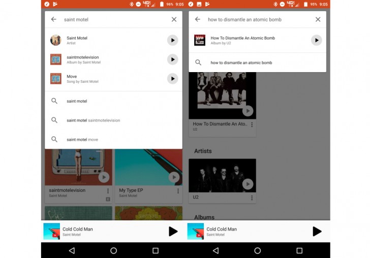 A few months ago, Google Play Music introduced the ability for you to play songs directly in its search interface but only on the web. This has so far been sorely missing from the service's mobile apps. That's about to change, however. Google is now testing the addition of the same function inside Play Music for Android. The new feature isn't tied to a specific version of the app, as it's been spotted on both 7.9 and 7.10, so it means it arrives via a server-side switch if you're lucky enough. If you receive this, when you search for something in the app you'll see that the auto-suggestions have been pushed lower inside the dropdown. Above those you get the results for the artist, album, or track you searched for. And all of these have artwork on the left and a Play button on the right. If you tap that button, songs and albums will immediately start playing, while for artists you get a shuffle. As you'd expect, if you tap elsewhere inside a search result, you'll be taken to the corresponding listing. The new search dropdown is available everywhere in Play Music, and will surely be a huge time (or tap) saver if you know exactly what you're looking for. |